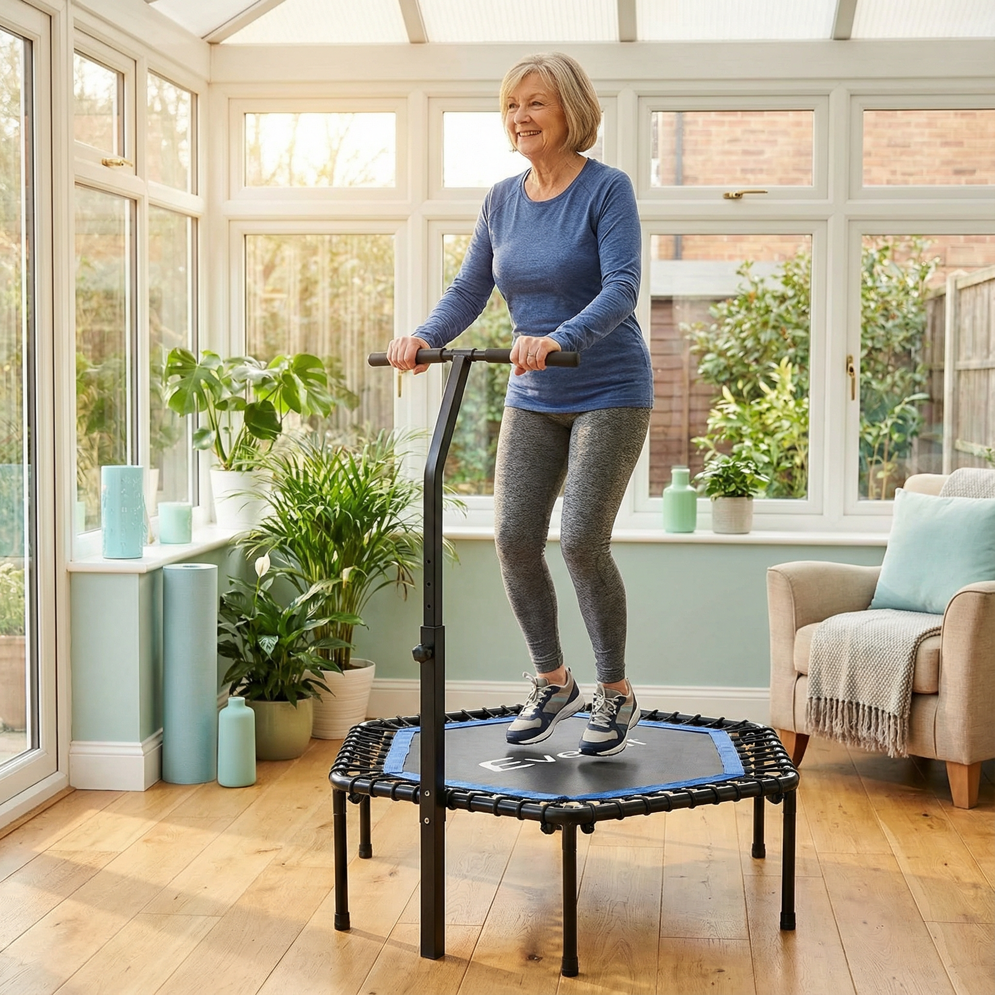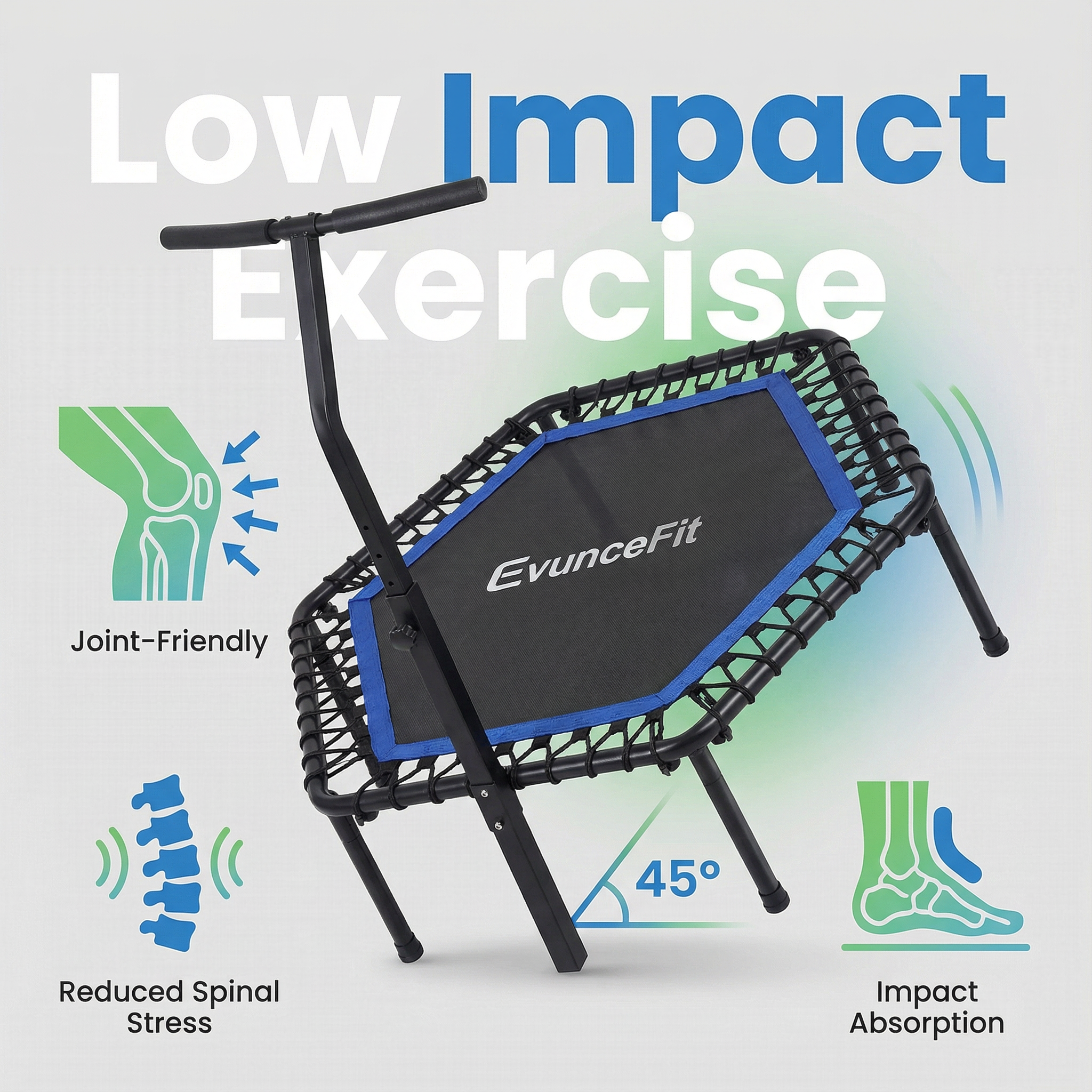 Rebounding on a mini trampoline like BounceFit provides a full-body, low-impact workout that improves cardiovascular health, balance, coordination, and core strength, while being much easier on the joints compared to running or high-impact exercises.