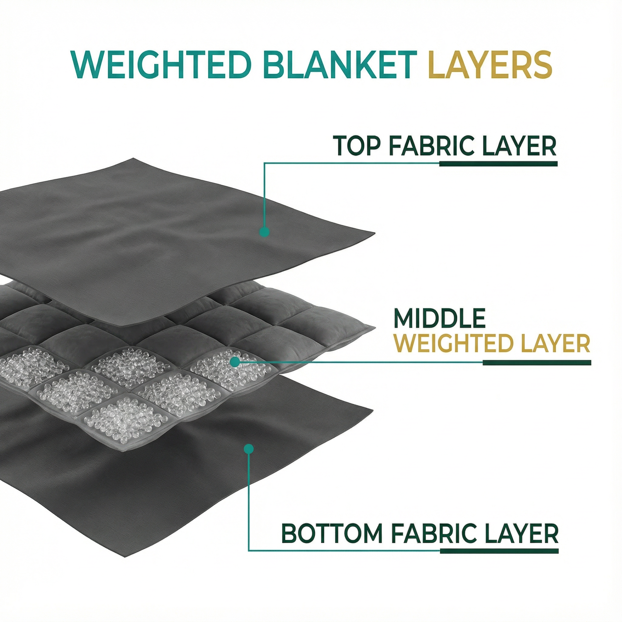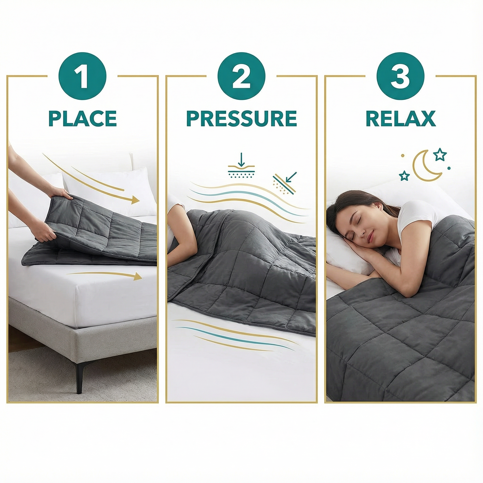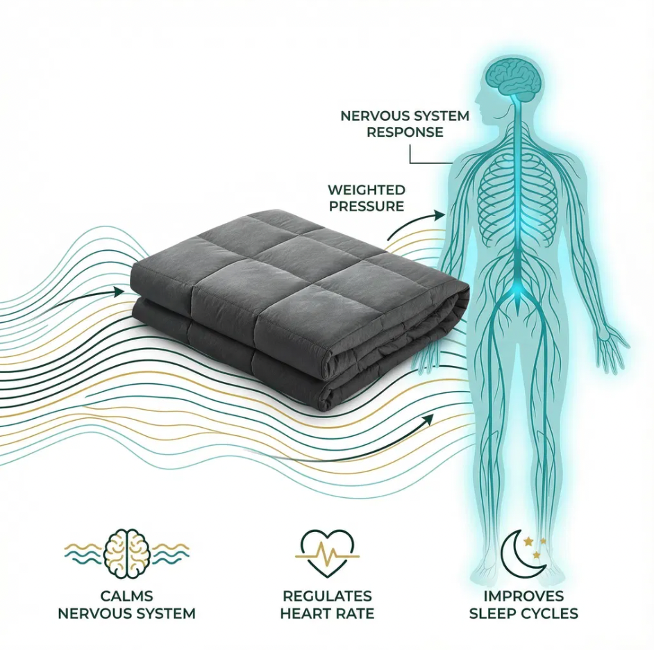 The blanket uses deep pressure therapy, a scientifically backed method that helps calm the nervous system, reduce cortisol (stress hormone), and boost serotonin and melatonin — helping you sleep deeper and feel calmer.