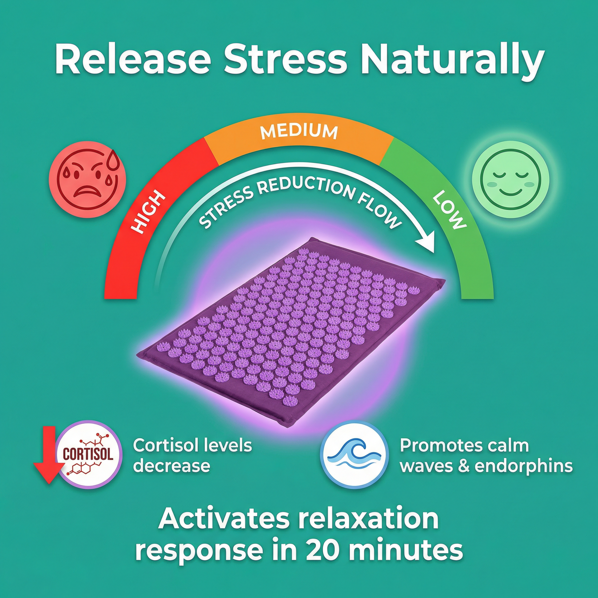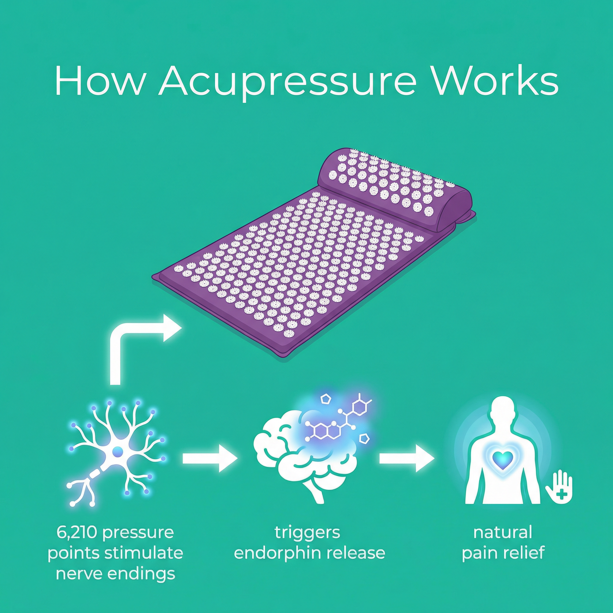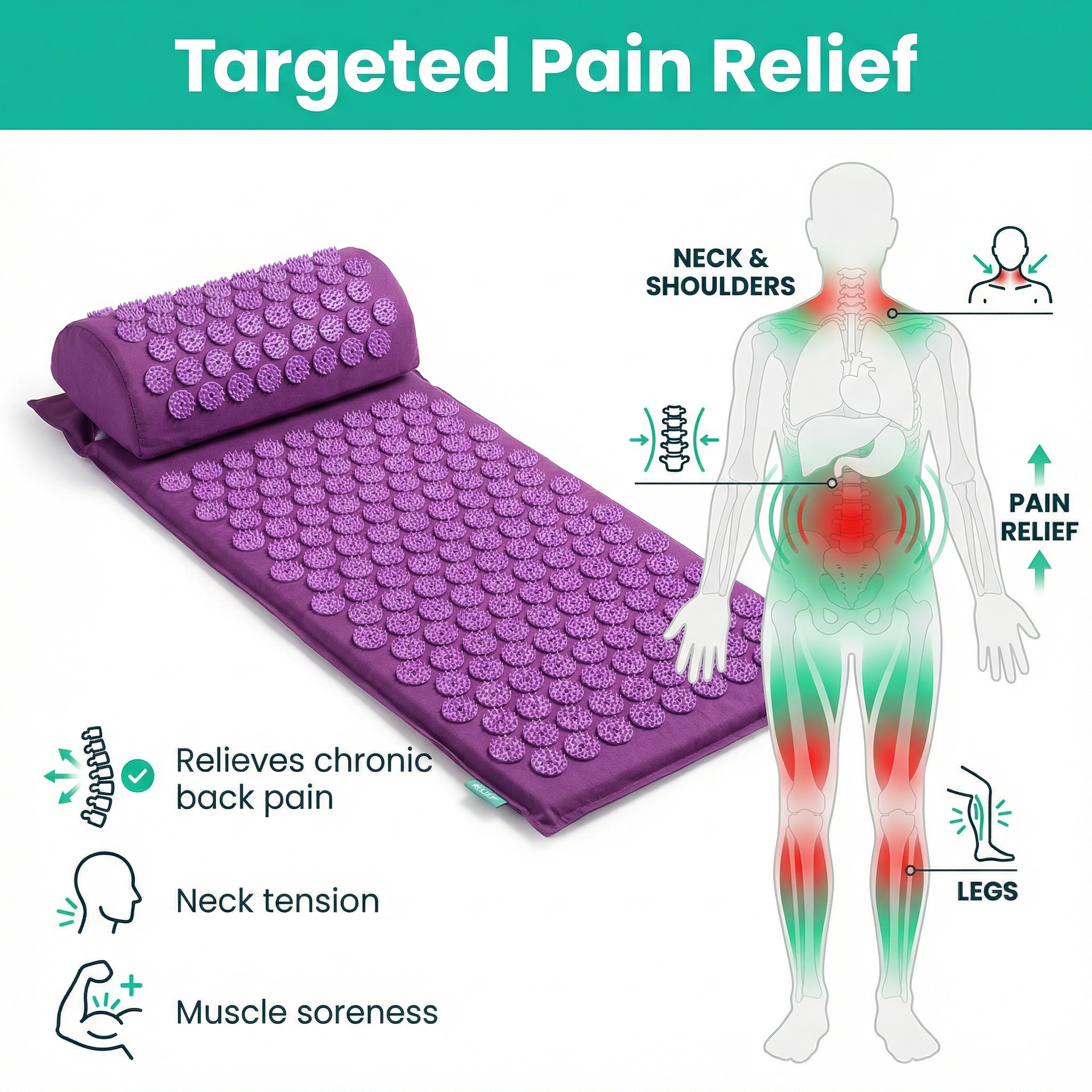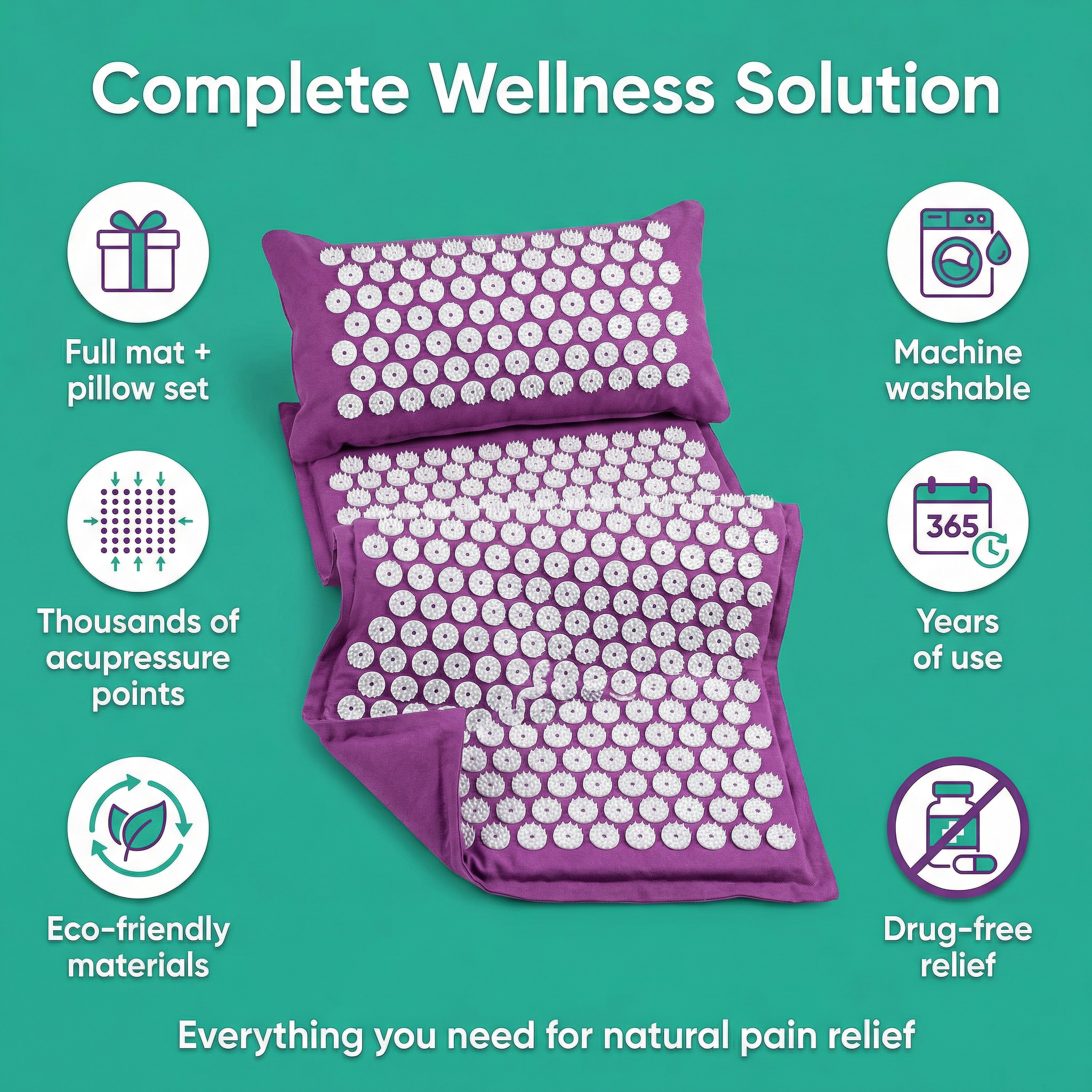 Terra Wellness acupressure mats provide relief for a wide range of conditions. Most effective for: chronic back pain (lower, middle, upper), neck and shoulder tension, sciatica and hip pain, fibromyalgia and chronic pain syndromes, stress and anxiety disorders, insomnia and poor sleep quality, muscle soreness and sports recovery, tension headaches and migraines, and poor circulation. The mat works by stimulating acupressure points that correspond to different body systems, triggering natural pain relief mechanisms, reducing inflammation, and promoting deep relaxation. While not a medical device or cure, consistent use (20 minutes daily) helps manage symptoms and improve quality of life for these conditions. Always consult your doctor for serious medical conditions.