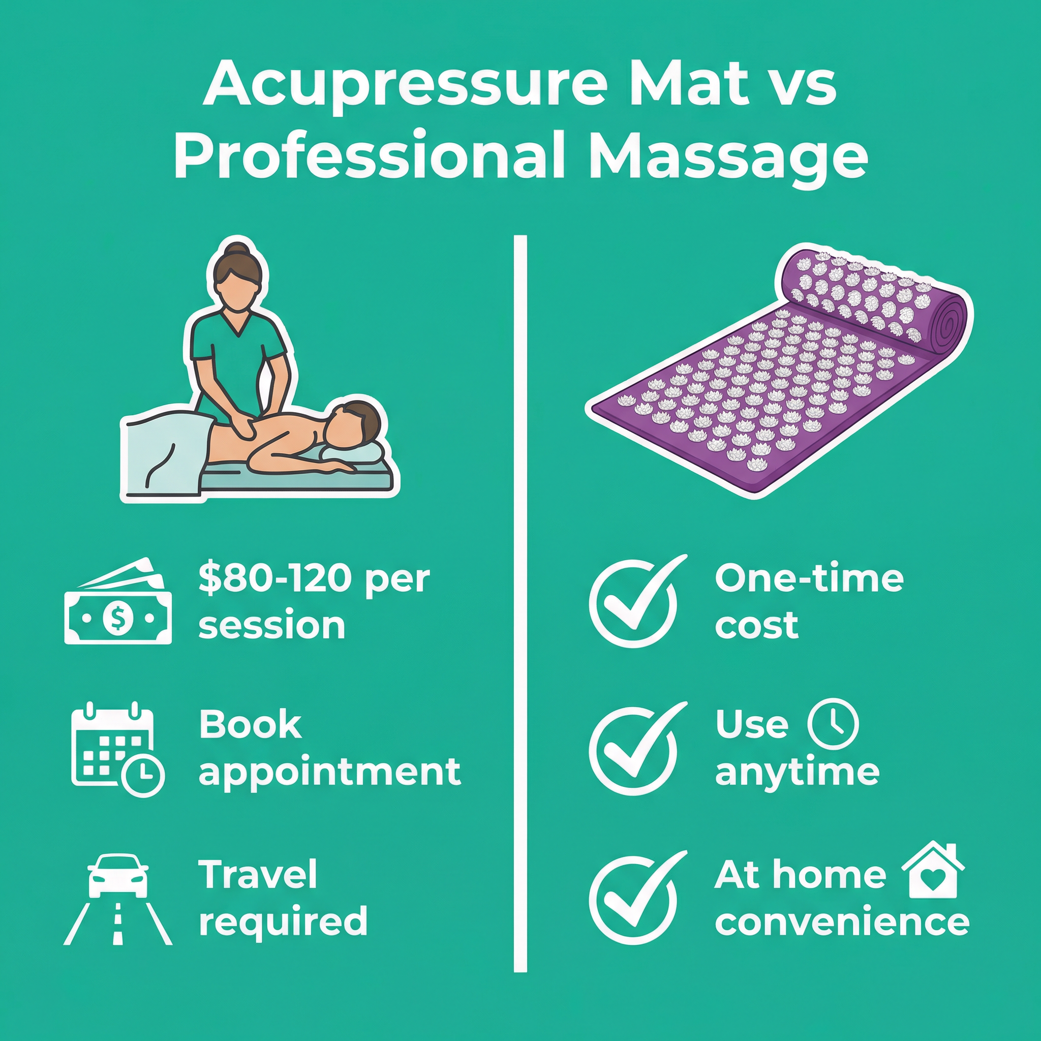 The cost-per-use makes acupressure mats one of the most economical pain relief investments available. Compare: Professional massage costs $80-150 per session, physical therapy runs $75-200 per session, and acupuncture costs $60-120 per session. If you get weekly massages, that's $4,000-7,800 annually. A Terra Wellness acupressure mat is a one-time investment that provides unlimited sessions. After just 3-4 uses, it pays for itself compared to a single massage. Plus, you control the schedule—use it anytime, as often as needed, without appointments or travel. While professional treatments have their place, the mat provides daily maintenance between sessions or serves as a complete standalone solution for many conditions. With our 90-day risk-free trial, you can test it against your current treatments with zero risk.