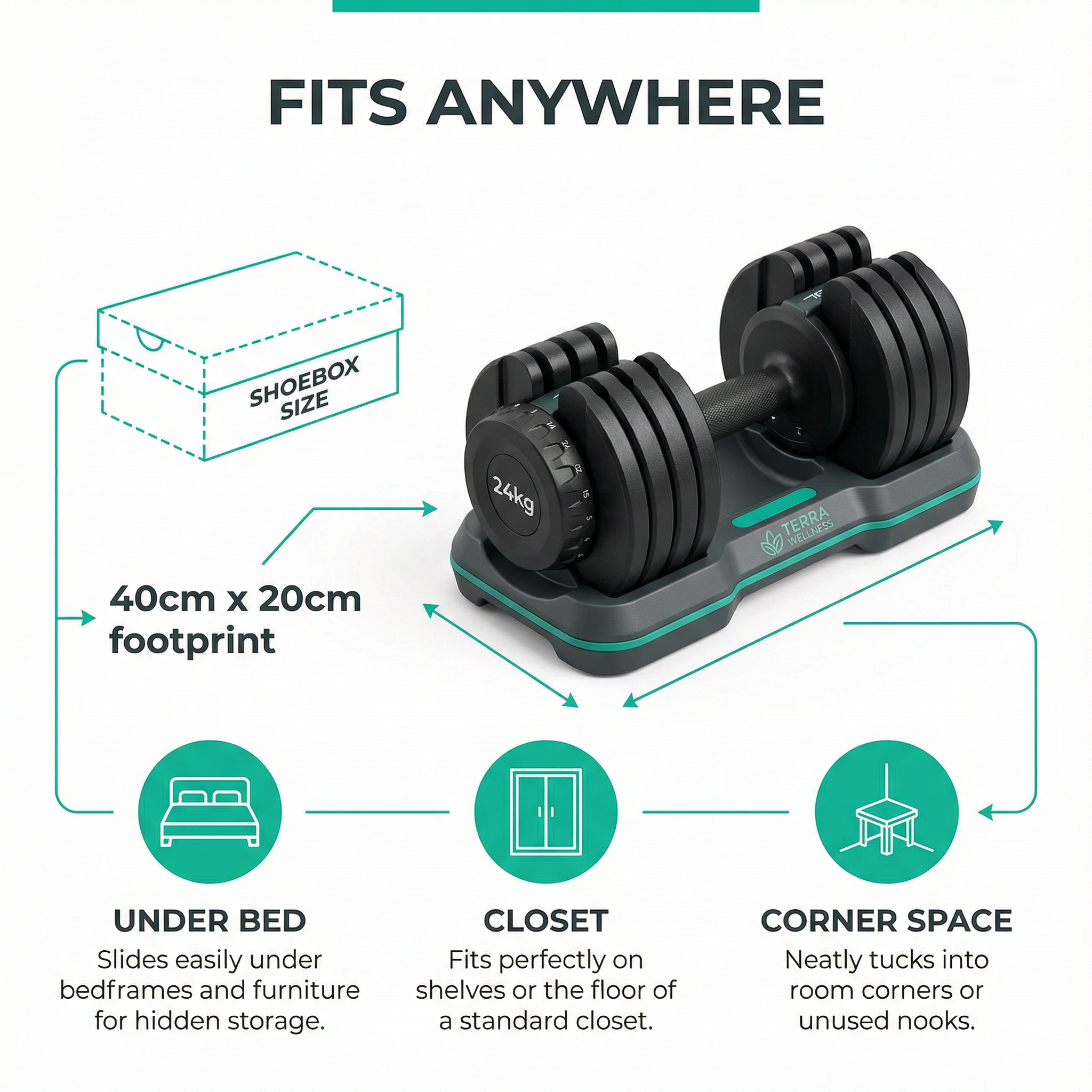 Terra Wellness 24kg Adjustable Dumbbells replace 12 pairs of fixed dumbbells, saving approximately 90% of floor space. A traditional dumbbell rack holding 2kg to 24kg weights requires roughly 1.5 to 2 meters of wall space and significant floor area. Our adjustable dumbbells take up just 40cm x 20cm of space when stored—about the size of a shoebox—and can fit in a closet, under a bed, or in a corner. This makes them perfect for apartments, small home gyms, or anyone who wants a clutter-free workout space. The compact design also means you can easily move them between rooms or take them to different locations. Compared to competitors offering only 16kg or 20kg max weight, our 24kg capacity provides more training potential without requiring additional space, giving you the best of both worlds: maximum versatility in minimum space.