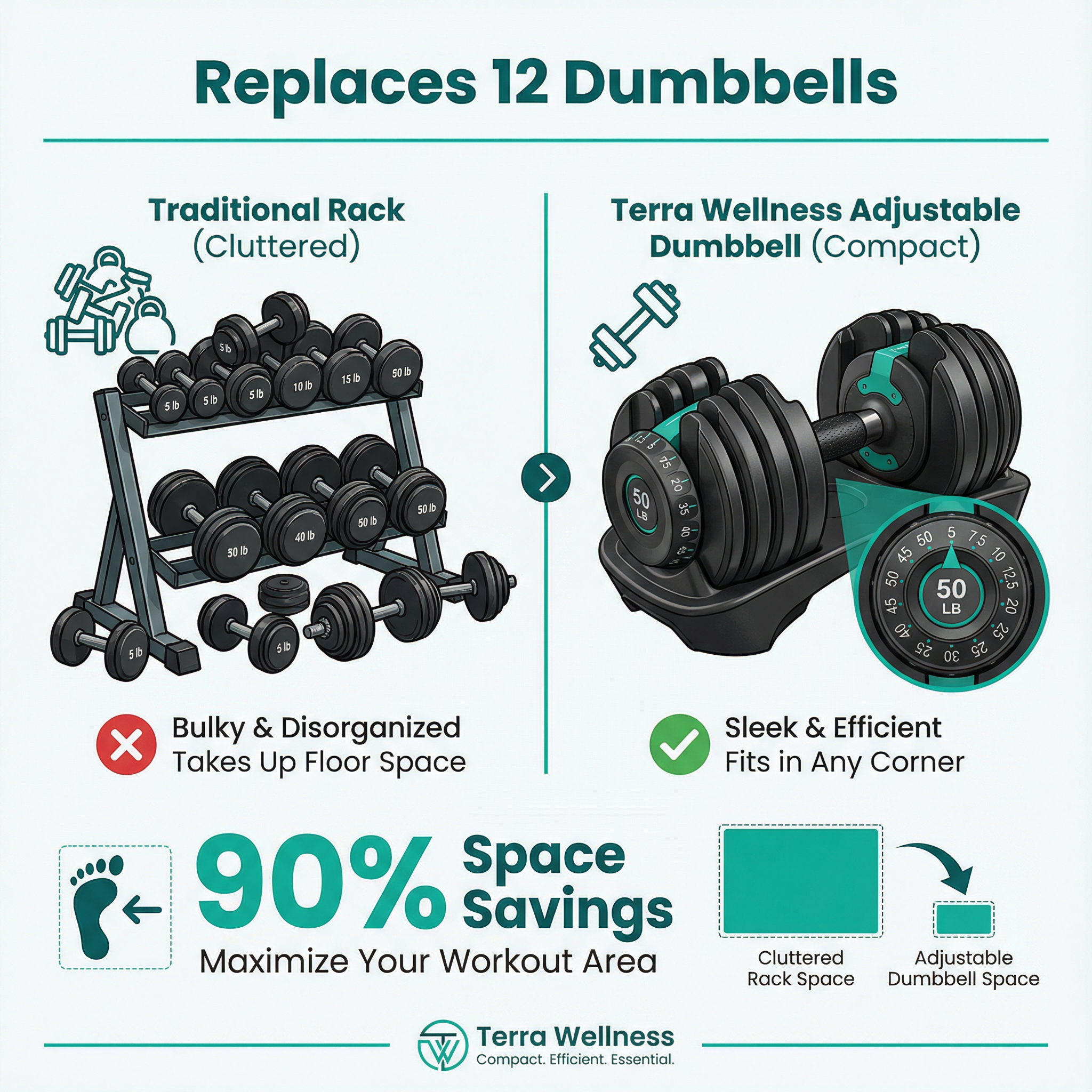 Terra Wellness stands out in the premium adjustable dumbbell market by combining professional-grade quality with exceptional value. Compared to brands like Bowflex SelectTech (often $600-800), our dumbbells offer similar build quality, weight range, and functionality at a significantly lower price point without compromising on materials or safety. Unlike Powerblock (which uses a bulky, less intuitive pin system), our dial-select mechanism is faster, more user-friendly, and takes up less space. Compared to IronMaster (which requires manual plate loading), our quick-change system saves time and maintains workout intensity. What sets Terra Wellness apart is our holistic wellness philosophy—we design equipment that supports your complete fitness journey, not just isolated workouts. Our dumbbells feature ergonomic handles that reduce wrist strain, smooth weight distribution that improves exercise form, and a compact design that promotes a clutter-free, mindful training environment. We also provide comprehensive workout guides and ongoing customer support to ensure your success. When you choose Terra Wellness, you're not just buying dumbbells—you're investing in a complete strength training solution backed by a brand committed to your long-term health and fitness goals.
