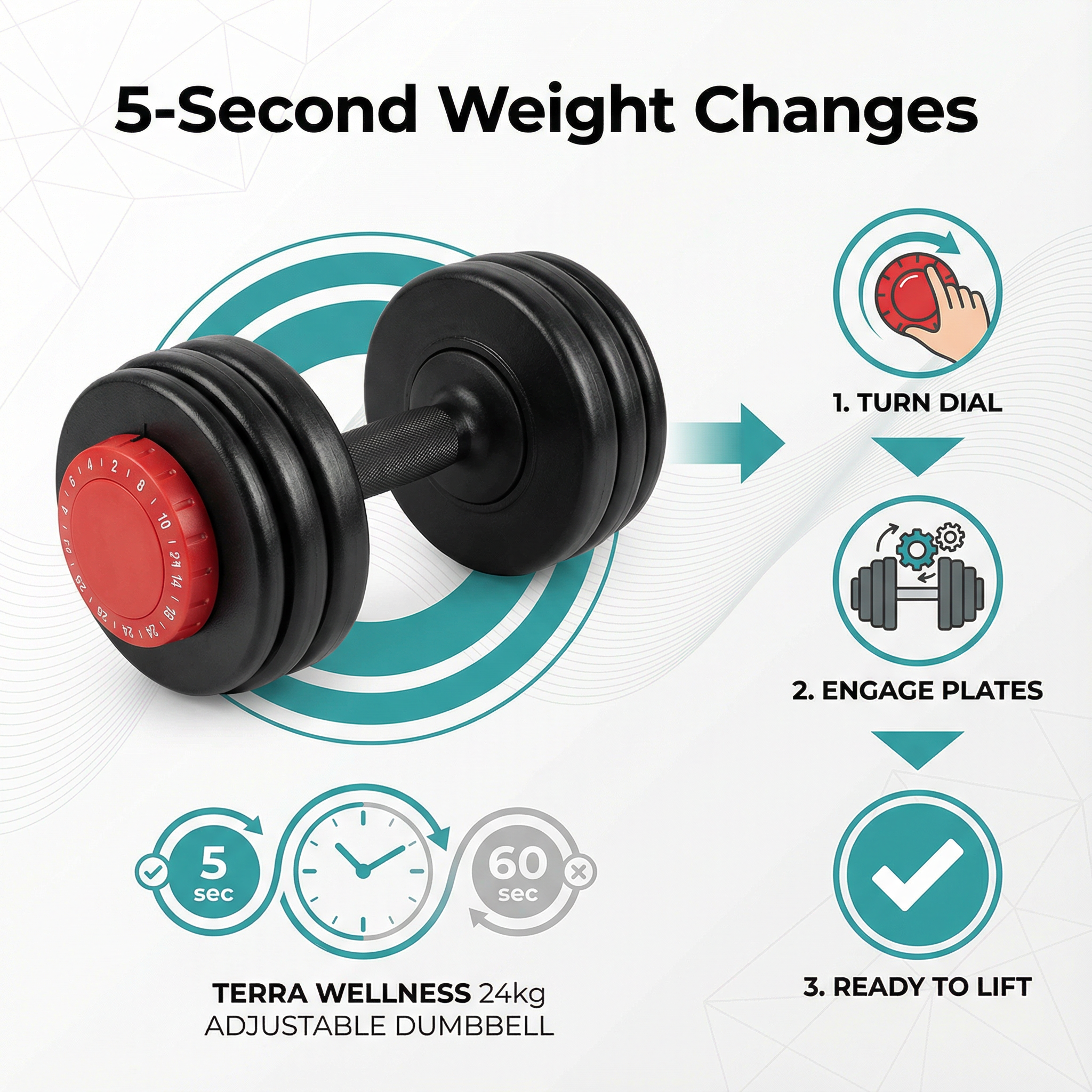 Our Terra Wellness dumbbells feature a quick-select dial system that lets you change weights in under 5 seconds—simply turn the dial to your desired weight, and the locking mechanism securely engages. This is significantly faster than traditional screw-collar adjustable dumbbells that can take 30-60 seconds to change, disrupting your workout flow and reducing training intensity. The intuitive design means no fumbling with pins, clips, or collars—just turn, lift, and train. This speed advantage is crucial for circuit training, drop sets, and supersets where quick weight changes maximize muscle fatigue and results. Unlike budget adjustable dumbbells with complicated adjustment systems, our streamlined design keeps your heart rate elevated and your workouts efficient, helping you build muscle faster.