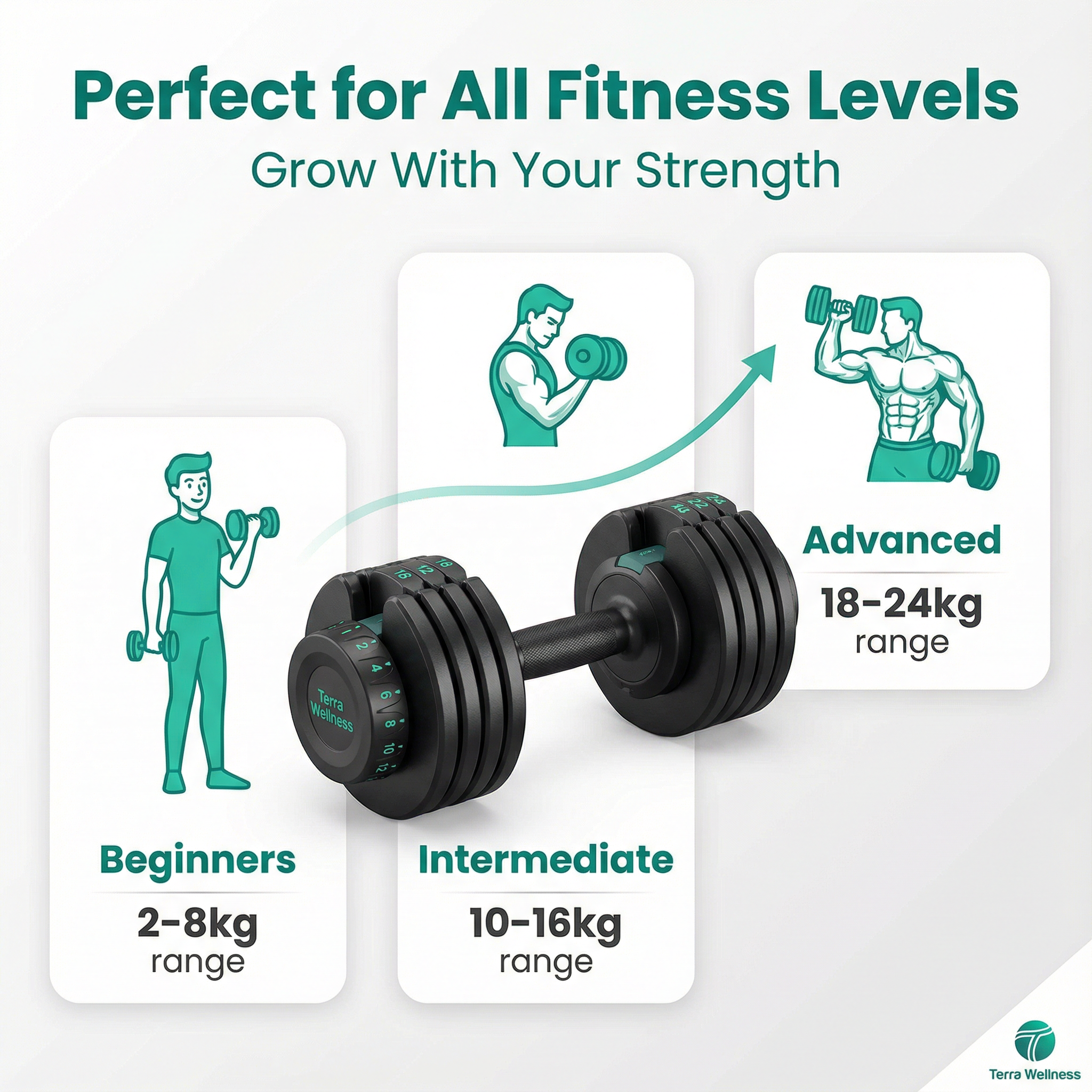 The Terra Wellness 24kg Adjustable Dumbbells adjust from 2kg to 24kg per dumbbell in 2kg increments, giving you 12 different weight options to match your fitness journey. This range is perfect for beginners starting with lighter weights (2-6kg for isolation exercises), intermediate lifters building strength (8-16kg for compound movements), and advanced users pushing limits (18-24kg for progressive overload). Whether you're doing bicep curls, shoulder presses, chest flies, or lunges, you'll have the right weight for every exercise and every fitness level. As you get stronger, simply adjust the weight—no need to buy new dumbbells. This versatility makes our adjustable dumbbells ideal for full-body workouts, from rehabilitation exercises to intense muscle-building sessions.