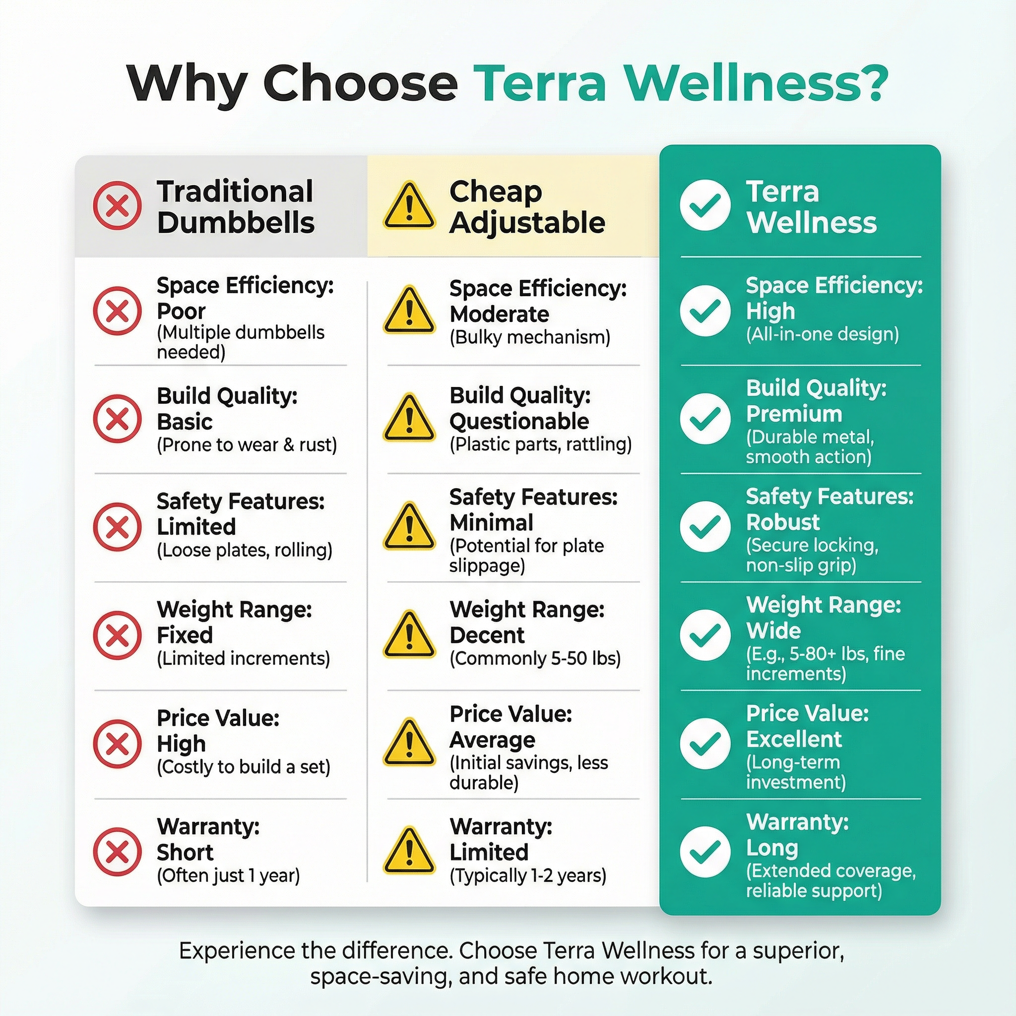 The key differences lie in build quality, safety, and long-term value. Terra Wellness dumbbells feature solid steel construction with reinforced locking mechanisms, while cheaper alternatives often use plastic components that crack or fail under load. Our precision-engineered dial system provides smooth, secure weight changes in 5 seconds, whereas budget options use pins or clips that can be fiddly, time-consuming, and potentially unsafe if not properly secured. The ergonomic handle design on Terra Wellness dumbbells distributes weight evenly and prevents wrist strain, while cheaper models often have uncomfortable grips that cause blisters and fatigue. Most importantly, our dumbbells are backed by rigorous quality testing and a comprehensive warranty—budget brands typically offer no warranty or support. While you might save $50-100 initially with a cheaper option, you'll likely need to replace them within 6-12 months. Terra Wellness dumbbells are a one-time investment that lasts years, making them significantly more cost-effective long-term. Plus, our 30-day risk-free trial means you can compare quality firsthand.