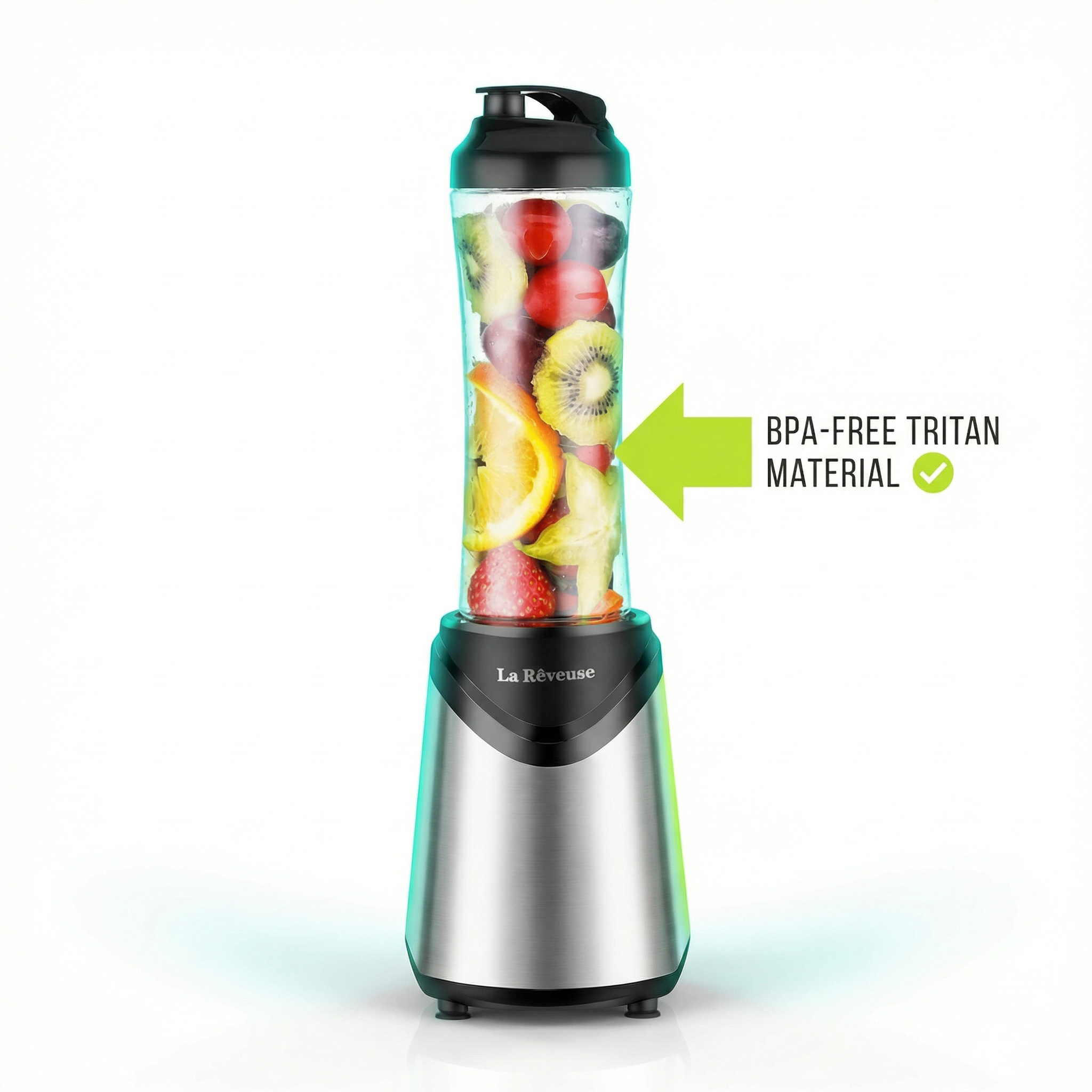 The BPA-free blending cup doubles as a take-away bottle, fitting most car cup holders for easy travel. Lightweight and easy to rinse clean, it’s ideal for home, office, gym, or travel use.