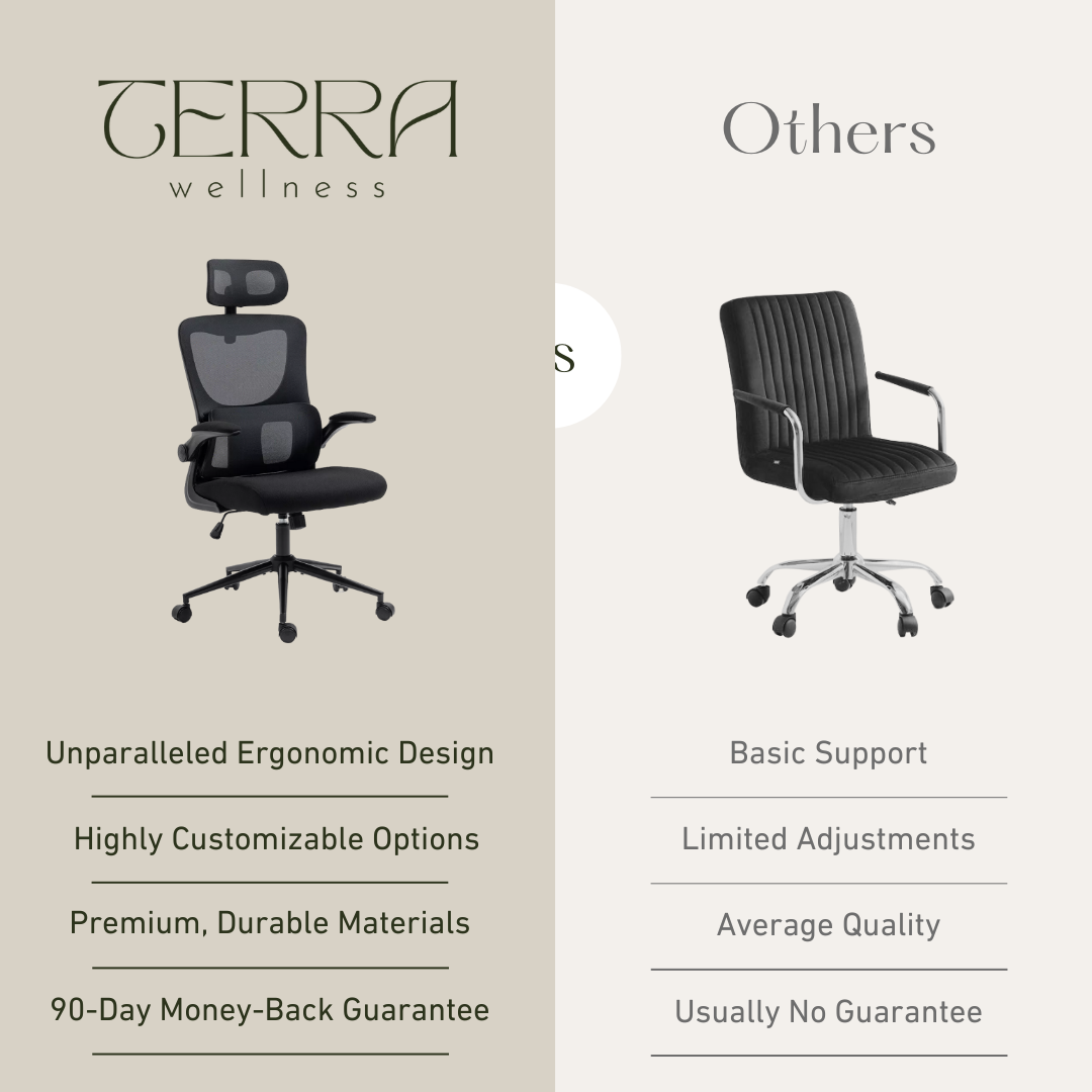 Unlike standard office chairs, our Ergonomic Office Chair is designed with precision engineering and premium materials to offer unparalleled support, style, and adjustability. With a 90-day money-back guarantee, you can discover the benefits risk-free.