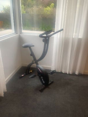 Black foldable exercise bike set up in a bright home gym, featuring a sturdy frame, cushioned seat, and digital display for effective cardio workouts.