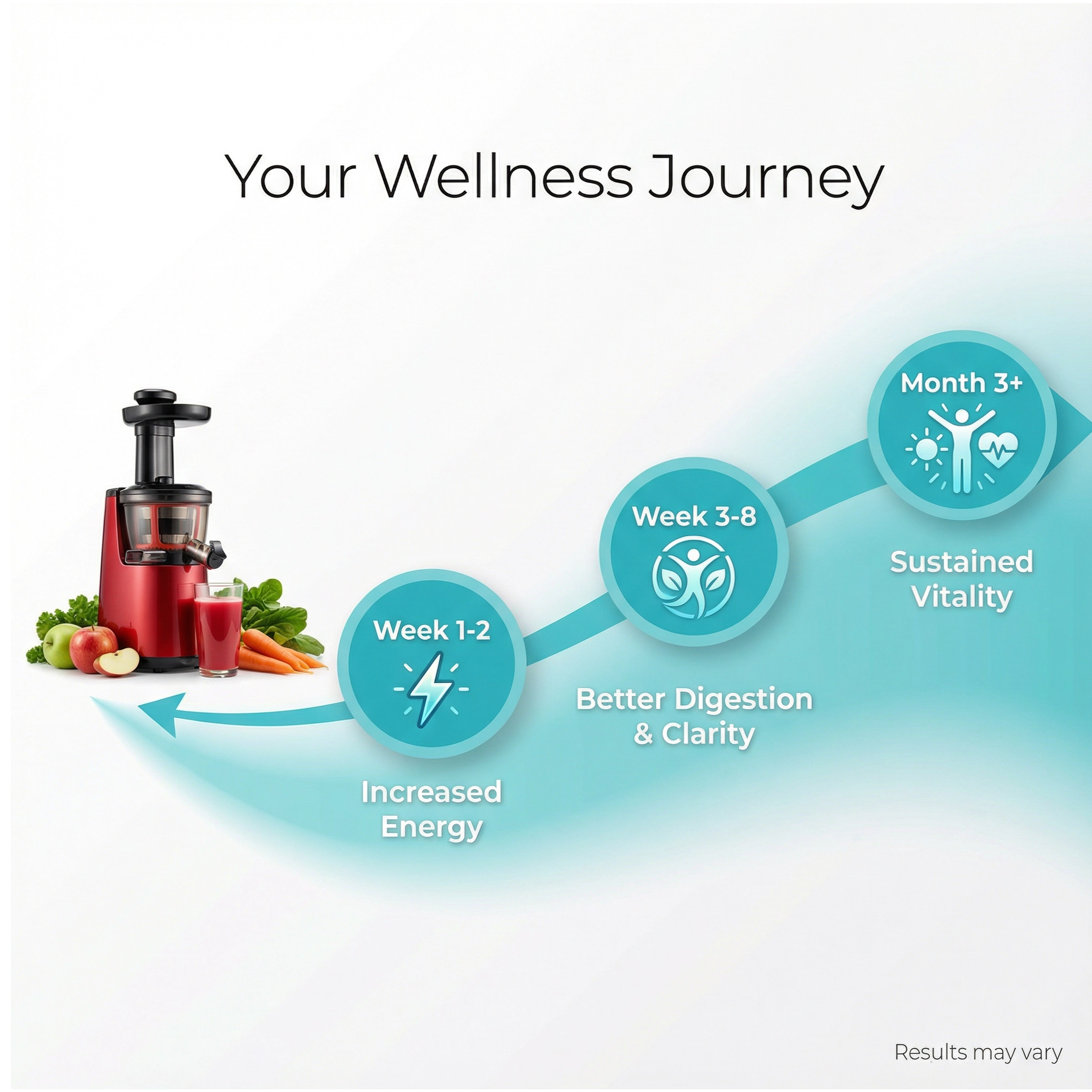 Notice significant improvements in energy levels and overall vitality in as little as 7-14 days. Our Cold Press Juicer expertly preserves maximum nutrients, provides optimal bioavailability, and helps you wake up feeling energized, rejuvenated, and ready to take on the day.