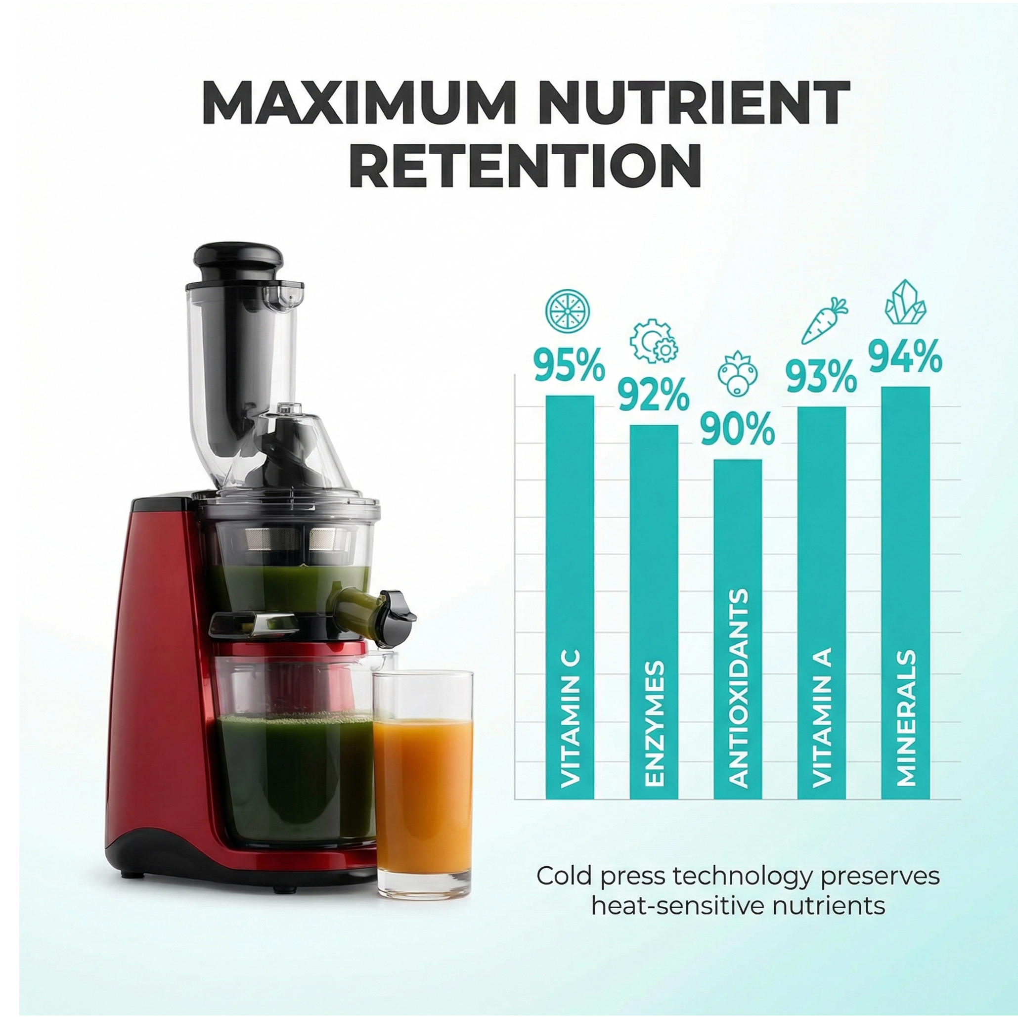 Our Cold Press Juicer features unique slow-extraction technology that adjusts pressure to different produce types, preserving vital enzymes and antioxidants that fast juicers destroy. The result is juice that not only tastes exceptional but also delivers the complete nutritional benefits your body needs.