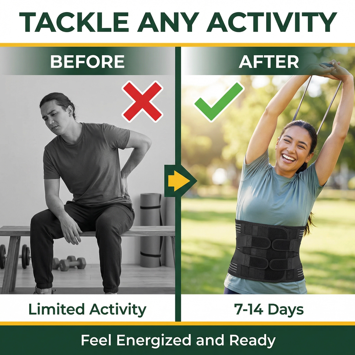 Experience significant improvement in lower back pain and posture in as little as 7-14 days of consistent wear. Our lumbar support brace expertly stabilizes your spine, provides optimal pressure distribution, and helps you move through your day feeling pain-free, energized, and ready to tackle any activity with confidence.