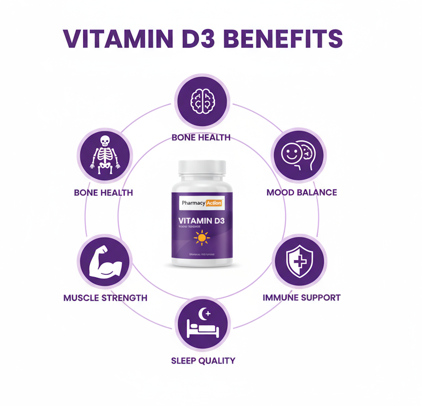 Vitamin D3 supports serotonin production, the neurotransmitter that regulates mood and emotional stability. Regular use helps reduce stress, fatigue, and mood swings — helping you feel brighter, calmer, and more balanced.