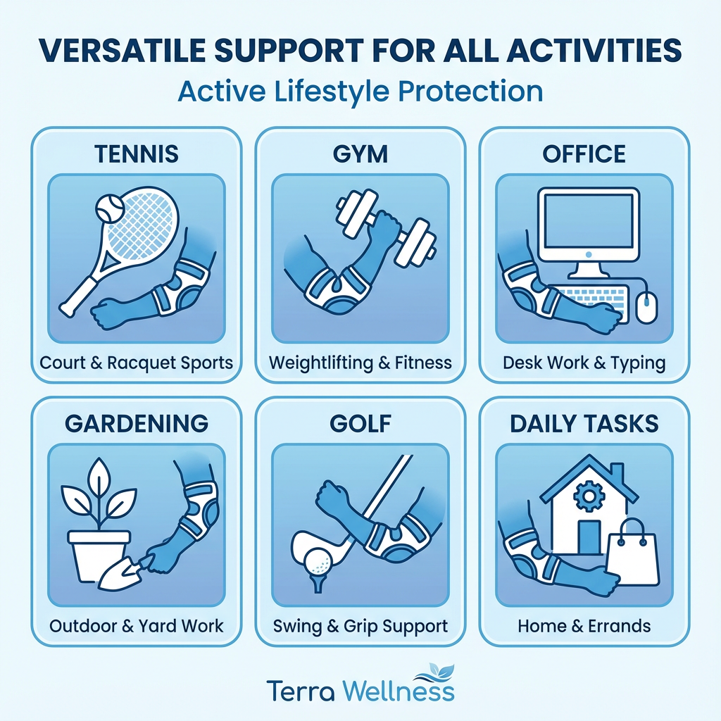 The Terra Wellness Tennis Elbow Brace reduces soreness, prevents flare-ups, and stabilizes your elbow during repetitive movements. Many users report enhanced grip, smoother motion, and the confidence to tackle daily tasks or sports again.
