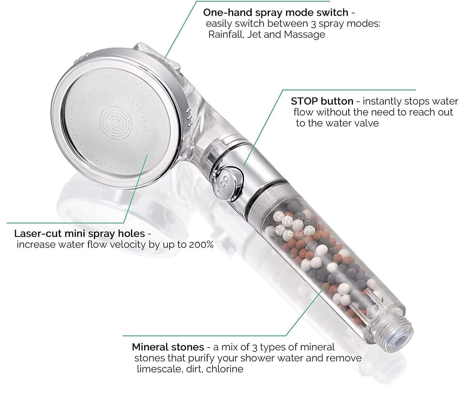 These mineral stones can be changed at any time by simply unscrewing the bottom of the shower head.