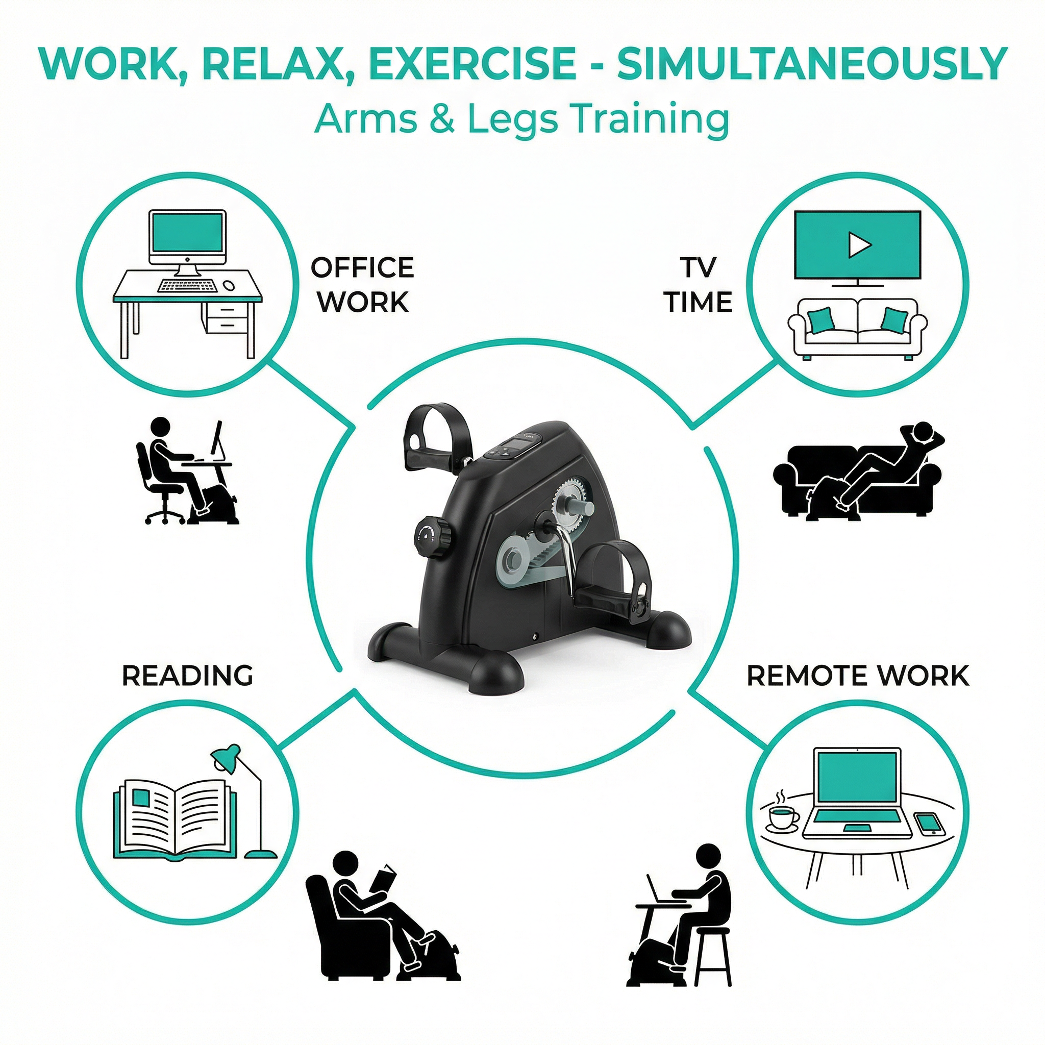 Most customers find that gentle pedaling actually improves their focus and productivity! The rhythmic movement increases blood flow and oxygen to your brain, helping you stay alert and reducing the dreaded afternoon slump. You can easily adjust the resistance to find your sweet spot—lower resistance for tasks requiring intense concentration (like writing or detailed work), higher resistance during calls, emails, or passive tasks. The smooth, natural pedaling motion becomes second nature within a few days, requiring no more mental effort than tapping your foot. Many customers report they're more focused, less fidgety, and experience fewer mental fatigue crashes since incorporating the bike into their workday. Unlike treadmill desks that require active attention and balance, our under desk bike allows you to work completely normally while reaping the benefits of continuous movement.