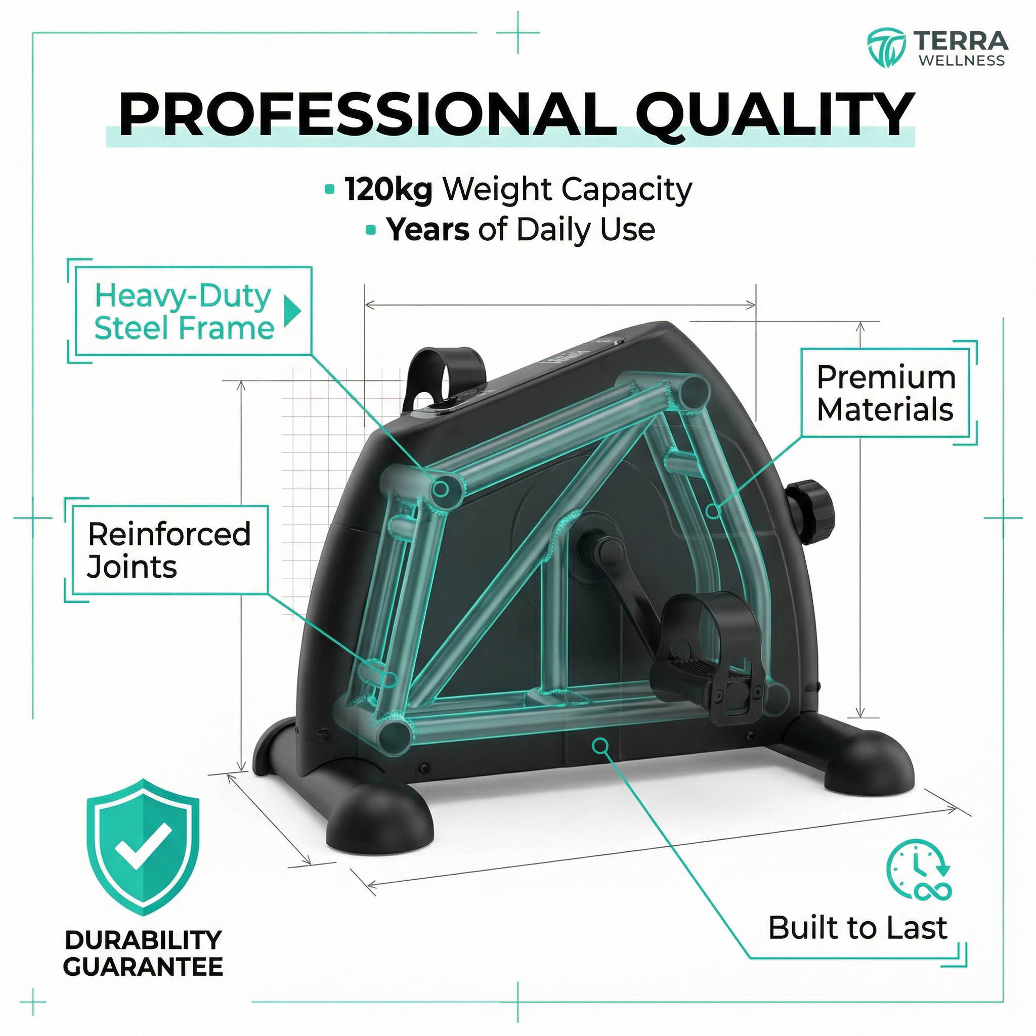 While basic pedal exercisers may cost $30-50 less, they typically use friction-based resistance that's noisy, inconsistent, and wears out quickly. The Terra Wellness Under Desk Exercise Bike features premium magnetic resistance that's silent, smooth, and virtually maintenance-free for years. Our precision-balanced flywheel prevents wobbling and ensures stable operation even at high speeds, while cheaper models often slide around or tip over. We also include a built-in LCD display that tracks time, distance, calories, and RPM—features often missing from budget alternatives. Plus, our reinforced steel frame supports up to 120kg, compared to flimsy plastic frames that crack under regular use. With our 90-day risk-free trial, you can experience the quality difference yourself—and most customers tell us they wish they'd invested in Terra Wellness from the start rather than wasting money on cheaper options that broke within months.
