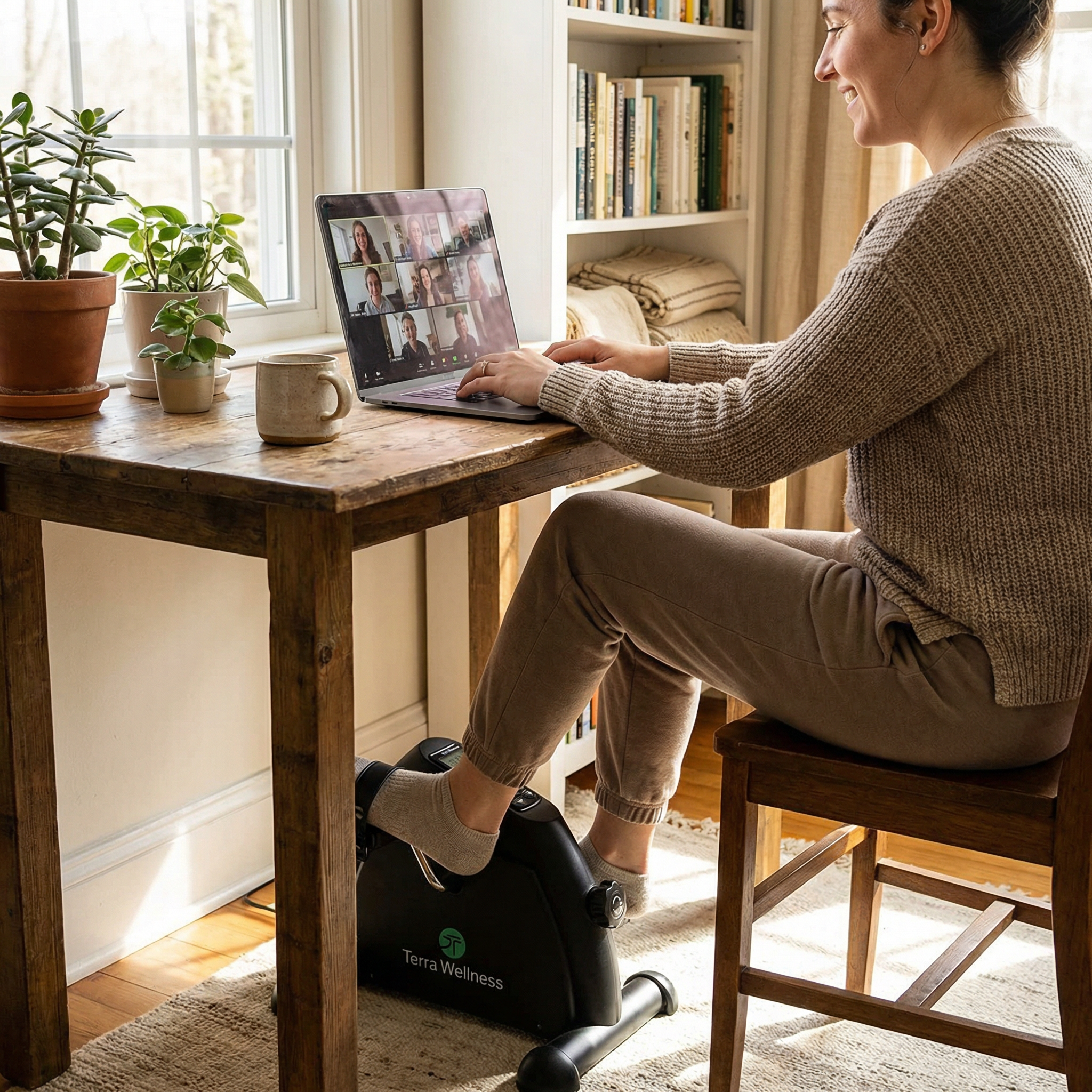 Absolutely! The Terra Wellness Under Desk Exercise Bike features precision-balanced magnetic resistance technology that operates in complete silence—no clicking, grinding, or whirring sounds. Thousands of customers use it during video conferences, phone calls, and in shared office spaces without anyone noticing. Unlike cheaper pedal exercisers with noisy friction-based resistance, our whisper-quiet design ensures zero disruption to your work or those around you. You can pedal away during your most important meetings with complete confidence.