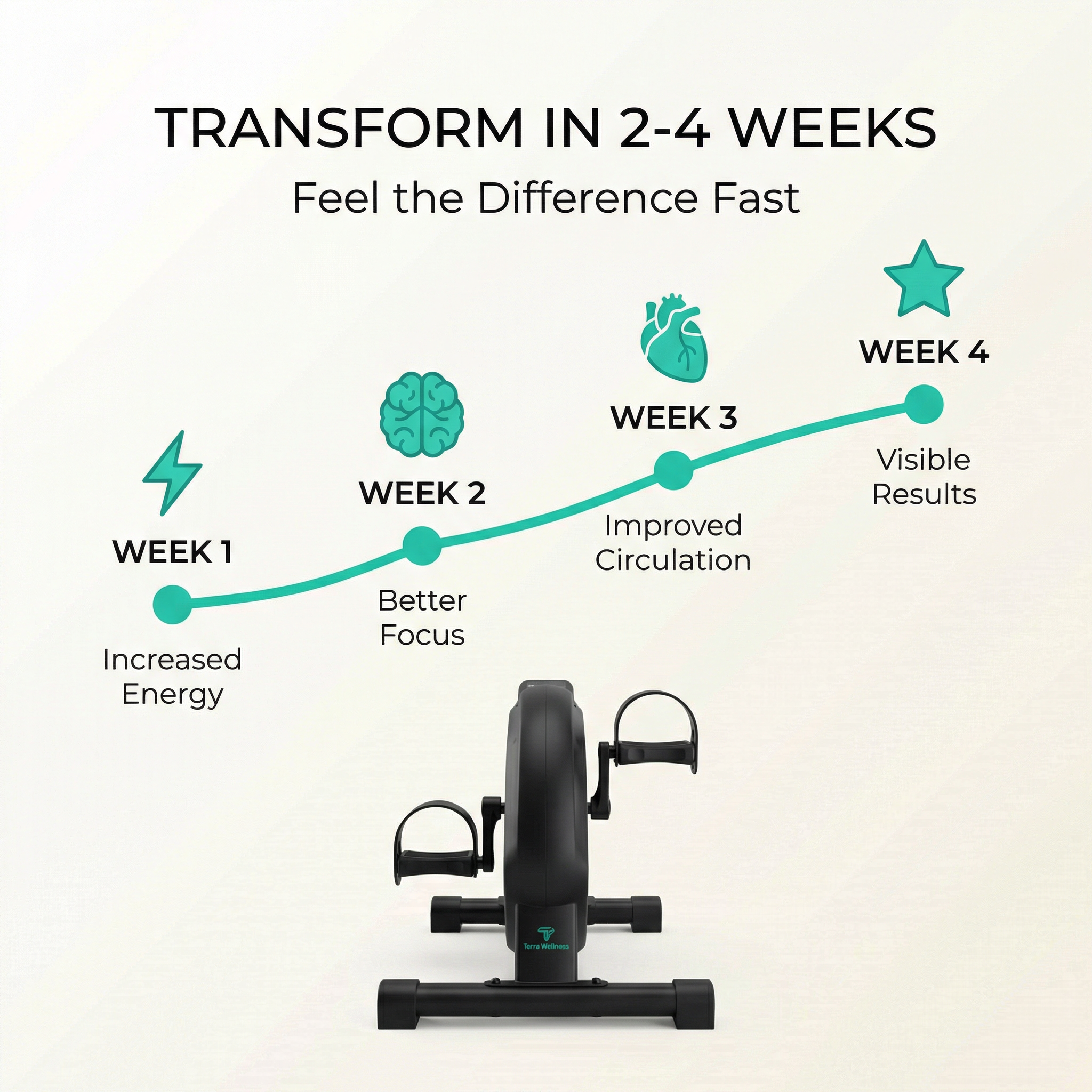 You'll start feeling more energized and focused within the first few days of use, even with just 20-30 minutes of daily pedaling. For weight loss and fitness improvements, we recommend 45-60 minutes per day, which easily breaks down into multiple sessions throughout your workday (15 minutes in the morning, 20 during lunch, 15 in the afternoon). The beauty of the Terra Wellness Under Desk Exercise Bike is that you're exercising while doing other activities, so it doesn't require dedicated workout time. Most customers naturally build up their usage as it becomes habit—many report pedaling 2-3 hours per day without even thinking about it because they're simultaneously working, watching TV, or reading. Consistency matters more than intensity: even 30 minutes of gentle daily movement delivers better long-term results than sporadic intense workouts. Start with whatever feels comfortable and let your usage grow naturally as your fitness improves.