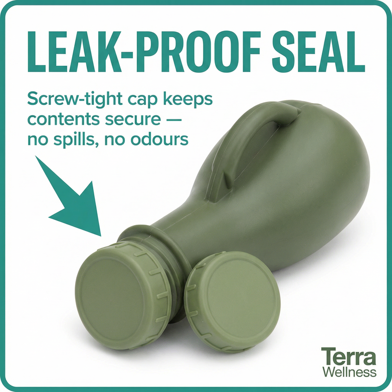 The Terra Wellness Portable Travel Urinal features precision-threaded screw cap with a tight compression seal specifically engineered to prevent leaks even when stored on its side. The cap locks firmly and will not loosen from movement or vibration during travel.