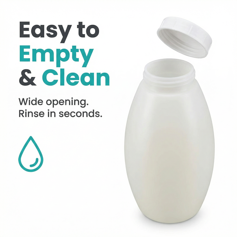 BPA-free odour-resistant plastic with smooth internal walls for effortless rinsing. Compact enough to store in a glove box, backpack, bedside drawer, or hospital bag.