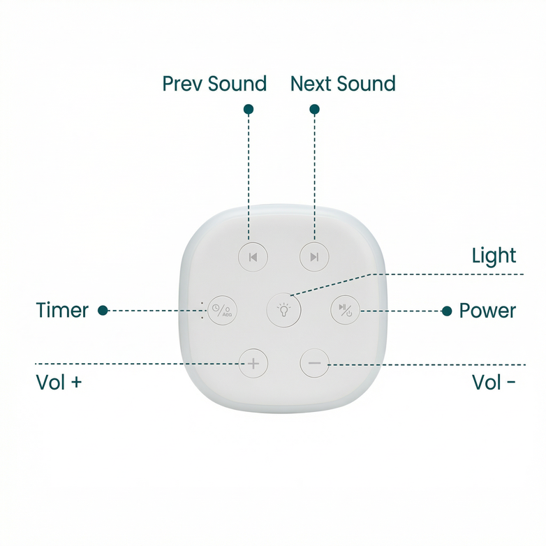 Rain, ocean, white noise, fan, forest, heartbeat, and lullaby — each chosen for maximum sleep effect. The colour night light makes it perfect for bedrooms, nurseries, and travel.