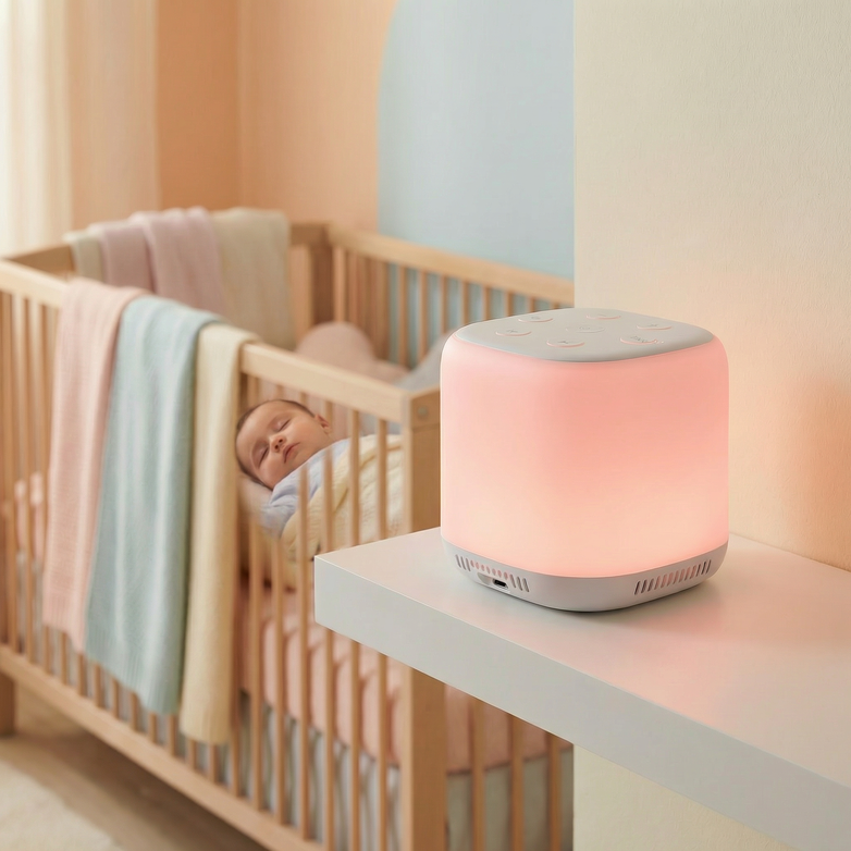 The night light is optional and fully controllable. You can run the sound with the light completely off, or choose from 7 calming colour modes at adjustable brightness — including a dim warm white that many users find helpful for settling babies.